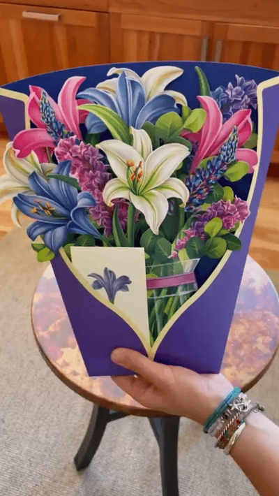 Each card unfolds into a stunning bouquet of paper flowers — vibrant, detailed, and full of warmth.